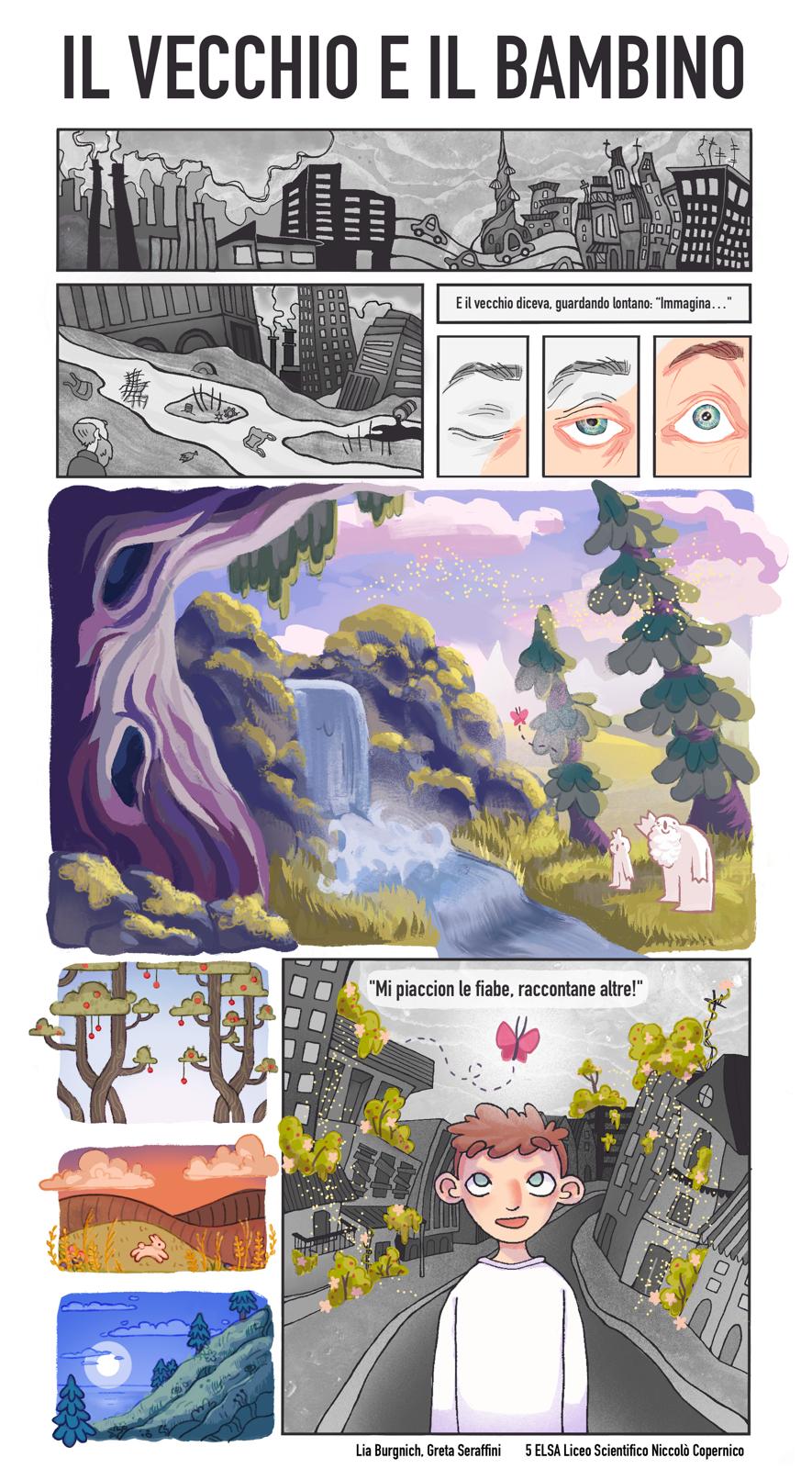 Per la sezione fumetto, la traccia prevedeva come tema l’“incontro generazionale” e proponeva un riferimento al brano Il vecchio e il bambino di Francesco Guccini, da cui prendere spunto per la realizzazione dell’elaborato. La canzone, caratterizzata da una forte critica sociale, ha orientato le studentesse verso una rappresentazione di un ambiente industrializzato e degradato.